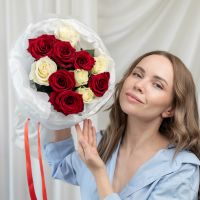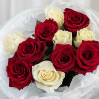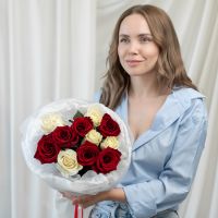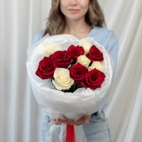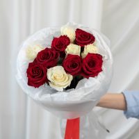 11 красно-белых роз (60 см) в дизайнерской упаковке.