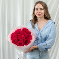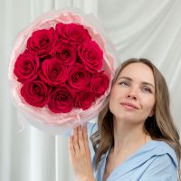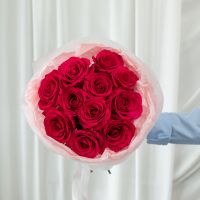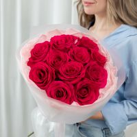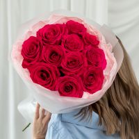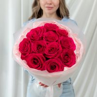 11 малиновых роз (60 см) в дизайнерской упаковке.