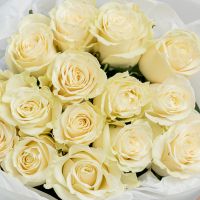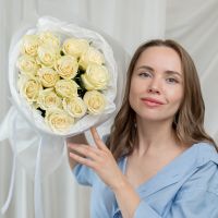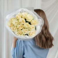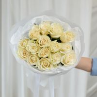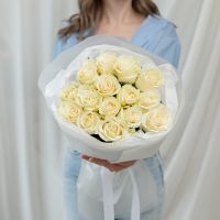 15 белых роз Эквадор (сорт Мондиаль) в объемной стильной упаковке.