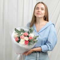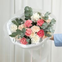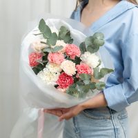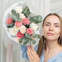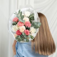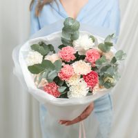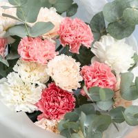 В составе 15 диантусов с эвкалиптом в дизайнерской упаковке.