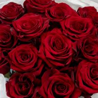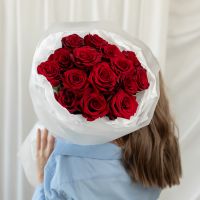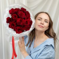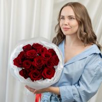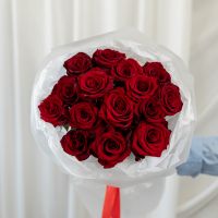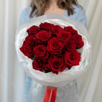 15 красных роз (60 см) в дизайнерской упаковке.