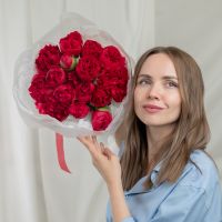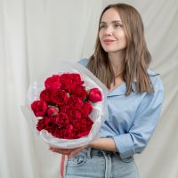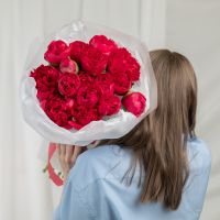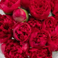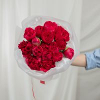 В составе 15 красных пионов в дизайнерской упаковке.