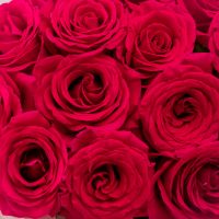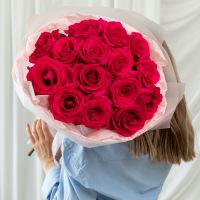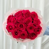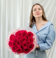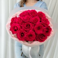 15 малиновых роз (60 см) в дизайнерской упаковке.