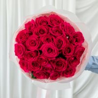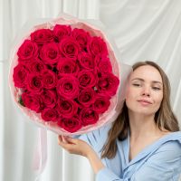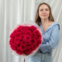 25 малиновых роз (60 см) в дизайнерской упаковке.