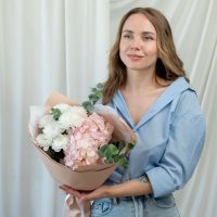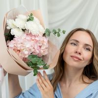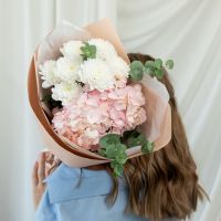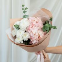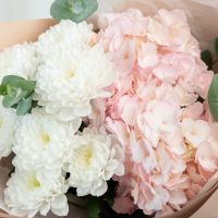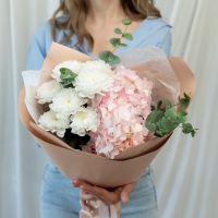 В составе хризантема кустовая (сорт Алтай) 1 шт, гортензия 1 шт, эвкалипт 1 шт, упаковка дизайнерская.