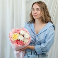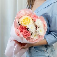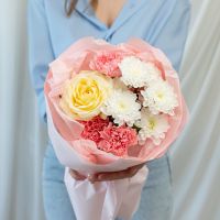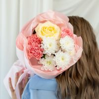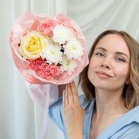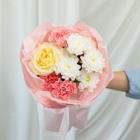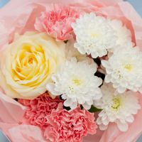 В составе хризантема кустовая (сорт Алтай) 1 шт, диантус 3 шт, роза кремовая (сорт Кендел Лайт) 1 шт, упаковка дизайнерская.