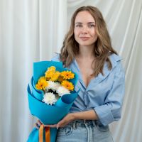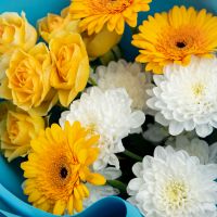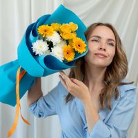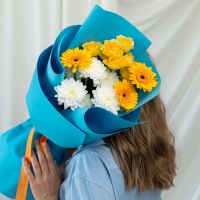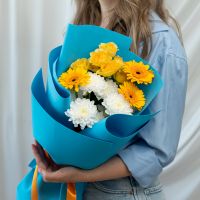 В составе хризантема кустовая (сорт Алтай) 1 шт, кустовая роза 1 шт, гербера 3 шт, упаковка дизайнерская.