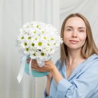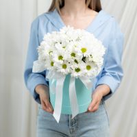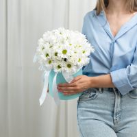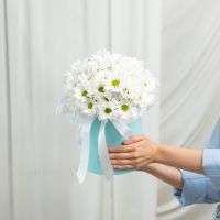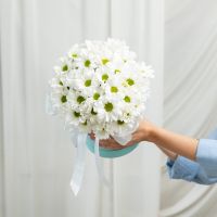 В составе ромашка белая (сорт Бакарди 3 шт), шляпная коробка, флористическая губка.