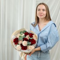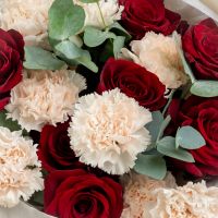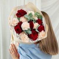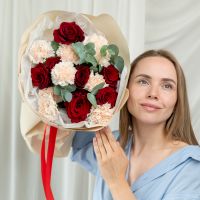 В составе красная роза (сорт Эквадор) 7 шт, диантус 9 шт, эвкалипт 2 шт, упаковка дизайнерская.