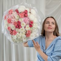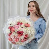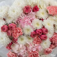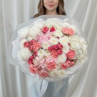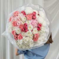 В составе хризантема кустовая (сорт Алтай) 6 шт, гортензия 4 шт, кустовая пионовидная роза 5 шт, дианутс 8 шт, упаковка дизайнерская.