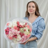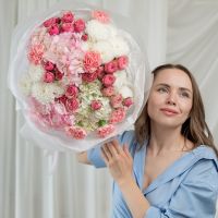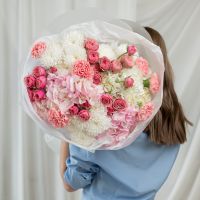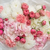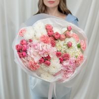 В составе хризантема кустовая (сорт Алтай) 3 шт, гортензия 3 шт, кустовая пионовидная роза 3 шт, дианутс 6 шт, упаковка дизайнерская.
