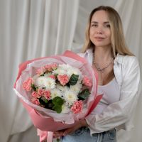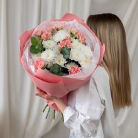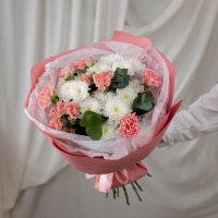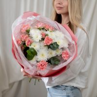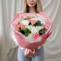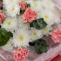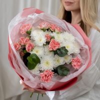 В составе хризантема кустовая (сорт Алтай) 3 шт, кустовая пионовидная роза 2 шт, диантус 5 шт, эвкалипт 3 шт, упаковка дизайнерская.
