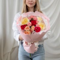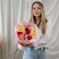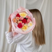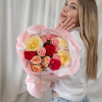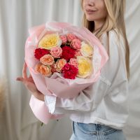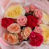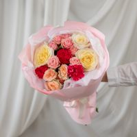 В составе роза кремовая (сорт Кендл Лайт) 3 шт, кустовая роза пионовидная 2 шт, диантус 3 шт, упаковка дизайнерская.