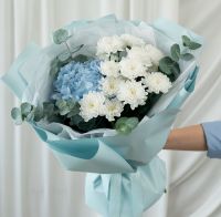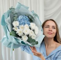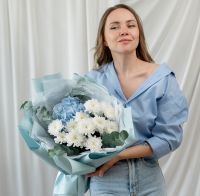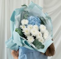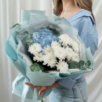 В составе гортензия 1 шт, хризантема кустовая (сорт Алтай) 2 шт, эвкалипт 3 шт, упаковка дизайнерская.