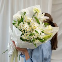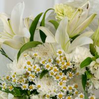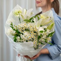 В составе лилия 1 шт, матрикария 2 шт, альстромерия 2 шт, диантус 5 шт, хризантема кустовая (сорт Алтай) 2 шт, упаковка дизайнерская.