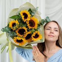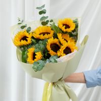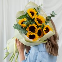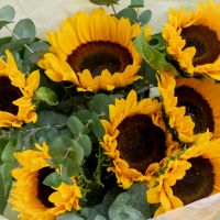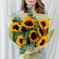 В составе подсолнух 7 шт, эвкалипт 4 шт, упаковка дизайнерская.
