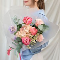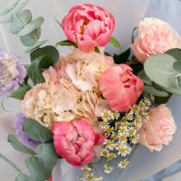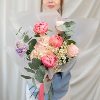 В составе горетнзия 1 шт, ромашка 1 шт, пион (сорт Корал Шарм) 1 шт, роза (сорт Пинк Мондиаль) 2 шт, эустома 1 шт, эвкалипт.