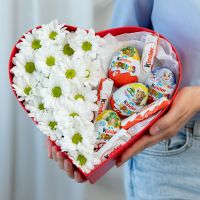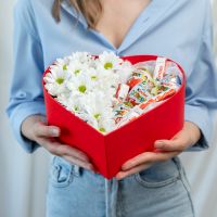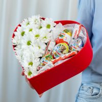 В составе хризантема кустовая (сорт Бакарди) 3 шт, сладости микс 9 шт, сердце, флористическая губка.