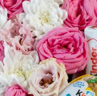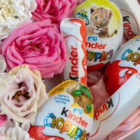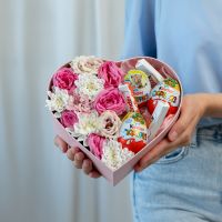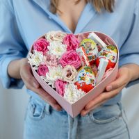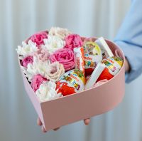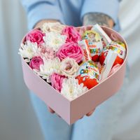 В составе хризантема кустовая (сорт Алтай) 1 шт, эутстома 1 шт, кустовая роза 1 шт, киндер 6 шт, сердце, флористическая губка.