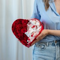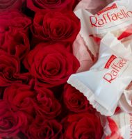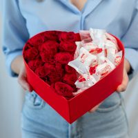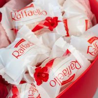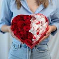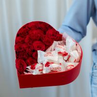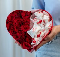 В составе роза (сорт Кения) 15 шт, раффаэло 11шт, сердце, флористическая губка.